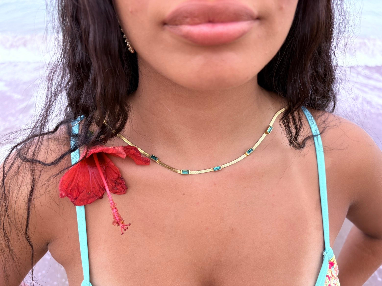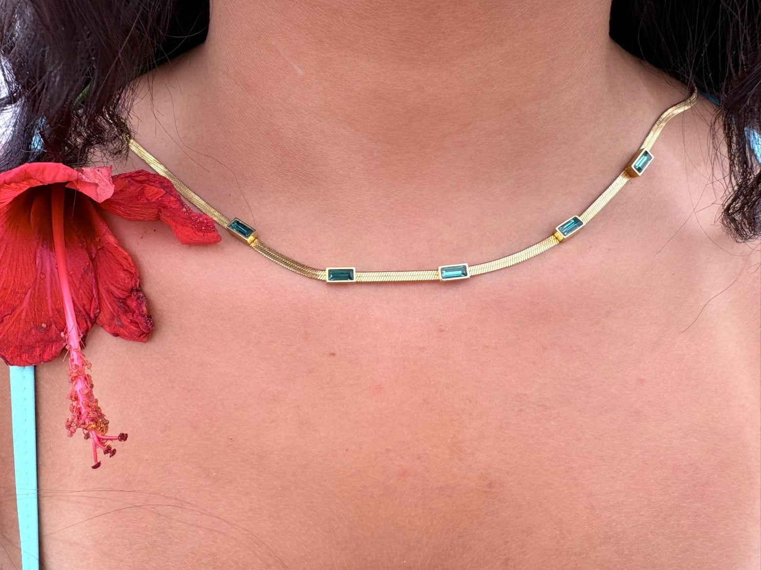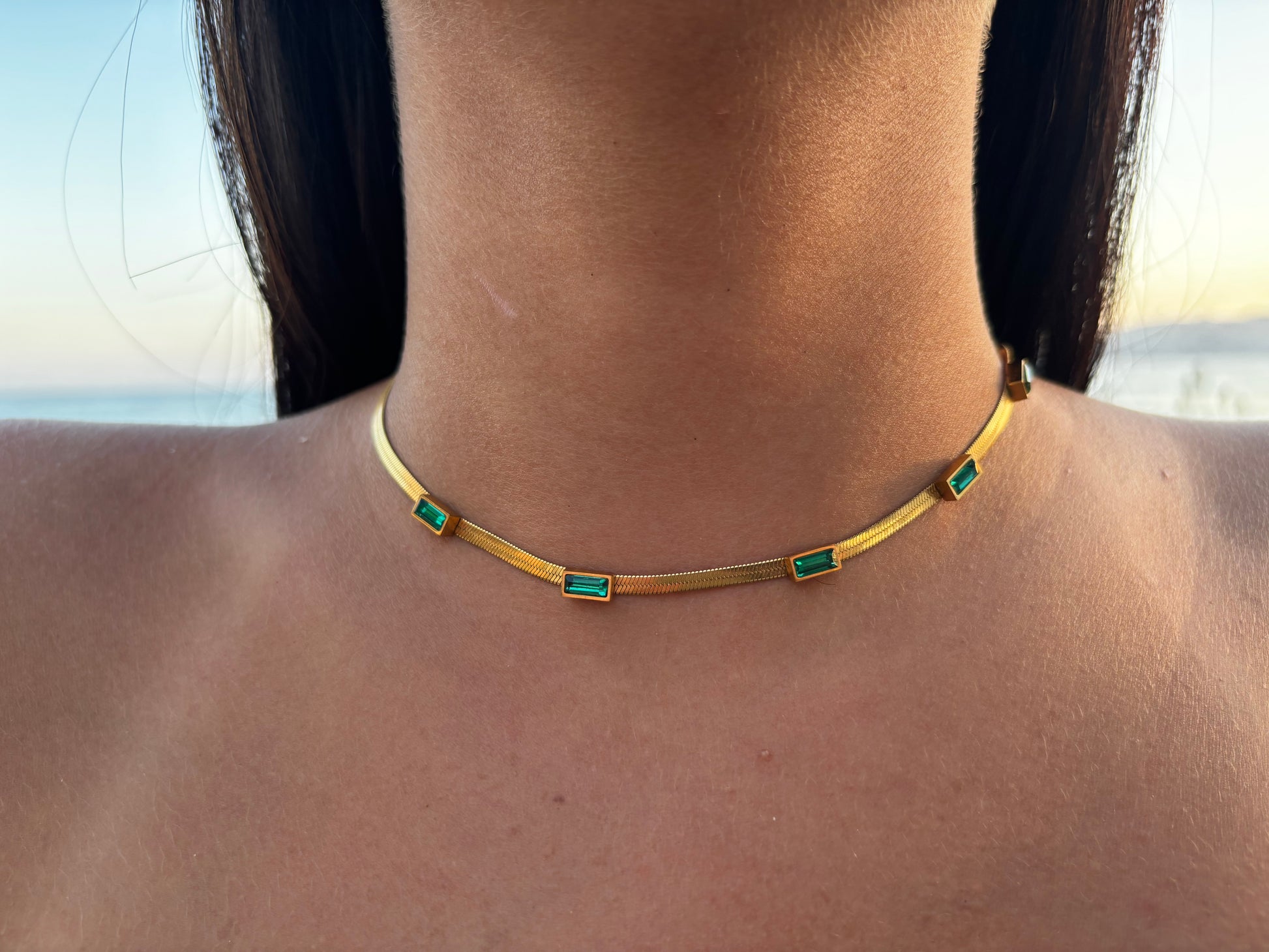 Collier aux cristaux verts taillés et détails dorés, lumineux et délicat, incarnant parfaitement l’élégance discrète.